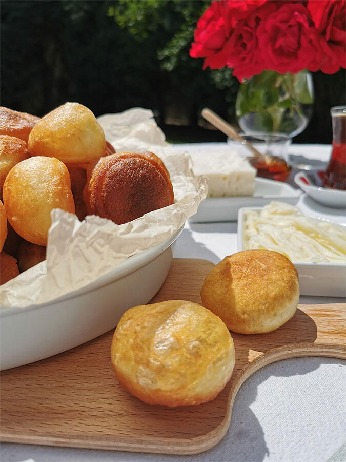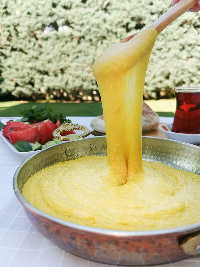 Самое популярное блюдо на завтрак на всём Черноморском побережье Турции это мухлама или куймак. Сытное, вкусное и полезное, оно представляет собой нежную тягучую сливочную массу из кукурузной муки и сыра. Главный её ингредиент это сыр, который должен при нагревании хорошо плавиться и тянуться. Берите турецкие сорта «kolot» или «çeçil» (они максимально напоминают сулугуни). Едят мухламу горячей, макая в неё свежий хлеб.