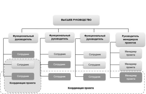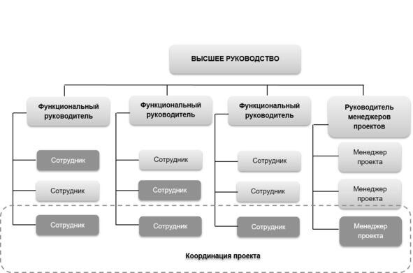 Также иногда встречается смешанная матрица, в которой проектами управляют как руководители проектов из Проектного офиса, так и другие сотрудники, которые занимаются координацией проектов, возникающих, например, в рамках подразделений.