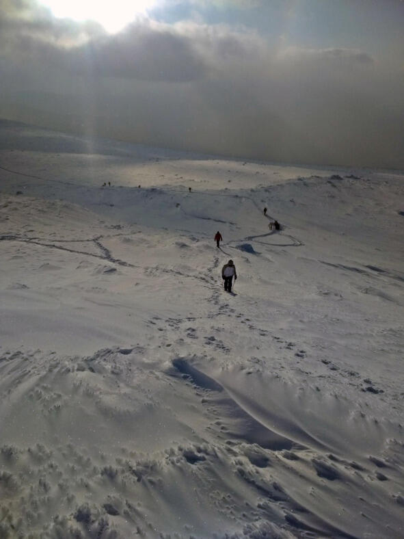 На вершине есть тур, флажки, всякие другие артефакты-сувениры. Летом есть. Зимой есть две плотные кучи снега, на которые удобно залезть и сфотографироваться. Вот только далеко фотографу отходить нельзя, потому что уже не просто в облаке стоим, а ещё и снег посыпал. Муть мутная, и холодно очень. Ещё пару снимков и вниз.