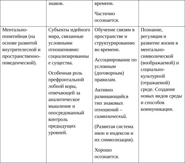 Последние рассуждения являются краеугольными для принимаемой нами концепции. «Познающее Тело» человека можно определить как целостную и динамично развивающуюся совокупность всех уровней сознания, мышления, коммуникации, которая включает: клеточно-тканевый (вегетативный, иконический), пространственно-поведенческий или ассоциативно-чувственный (животный, индексальный) и понятийно-временной (культурный, символический). А также все промежуточные стадий между ними.