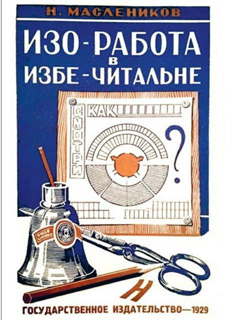 Сознательное и критическое воздействие на «психоидеологию» осуществлялось разными способами. Например, бесконечный поток книг, пособий, брошюр и статей учил новую аудиторию, как смотреть картину, делать плакат, рисовать рисунок для стенной газеты или использовать изоматериалы «на службе массовых кампаний»[55]. Обложка пособия Николая Масленникова «Изо-работа в избе-читальне» (1929) показательна в этом плане. (Илл. 8)