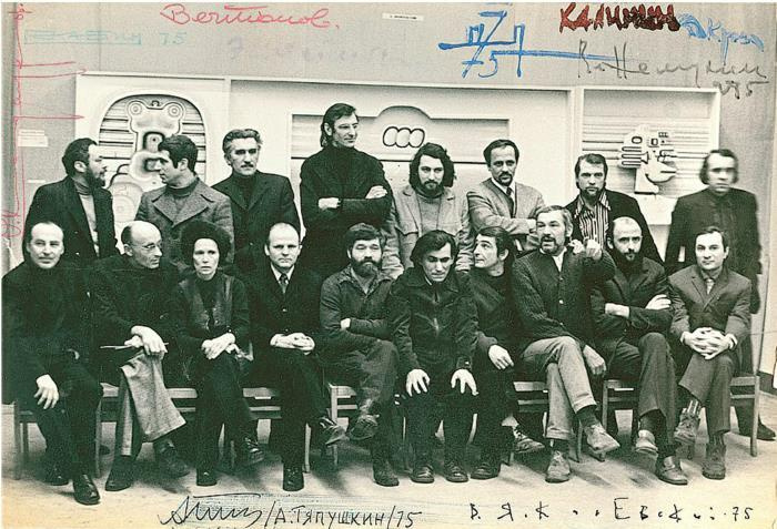 Синтия Надельман, Artnews, 1983В контексте гендерного равенства, провозглашенного в период большевистской революции и последующего появления «великих художниц» в авангардных кругах, вопрос, поставленный американским историком искусства Линдой Нохлин в ее нашумевшем эссе «Почему не было великих художниц?», казался неуместным. Однако в 1971 году, когда эта статья была напечатана, политический климат и социальная атмосфера в Советском Союзе кардинально изменились, делая заданный Нохлин вопрос более релевантным. К тому времени в официальном арт-мире женщины-художницы могли обрести голос, будь они готовы принять или взять на вооружение маскулинную позицию, препорученную трудящимся женского пола вышестоящими инстанциями. Возникшие в результате этих усилий режимы сигнификаций сделали советский художественный мир еще более непривлекательным для женщин и вернули их к дореволюционной ситуации. Как рассказывала авангардистка Валентина Кулагина в своих дневниках, охота высокопоставленных чиновников от культуры за художницами продолжалась даже в 1930-е годы[1]. В послевоенный период отстоять свою позицию представлялось возможным, только будучи членом неофициальных кругов, принадлежность к которым, по словам художника Свена Гундлаха, требовала определенной смелости: «Быть альтернативным художником редкая и опасная профессия. Это как охота на львов»[2]. Лидия Алексеевна Мастеркова выбрала именно эту редкую профессию и в результате обрела особенный статус в истории послевоенного русского искусства. Этот статус убедительно демонстрируют исторические групповые фотографии московских неофициальных художников, где Лидия неизменно нарушает (или подвергает сомнению) тотальность мужского контингента, демонстрируя, что «альтернативная художественная среда [была] столь же фаллократична, как и официоз»[3]. [Илл. 1]