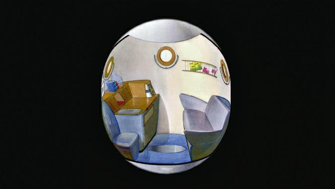 Илл. 11. Эскиз Галины Балашовой. Помещение космической капсулы. Дыра в полу ведет в центральный пост управления. Диван как связующее звено московского уюта и космических далей. Стул слева раскладывается и может служить туалетом. В условиях невесомости анус и «накопитель» необходимо соединять шлангом