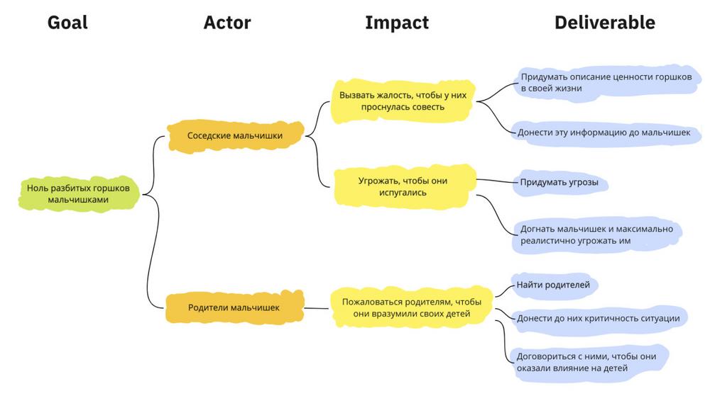 У гончара были три основные идеи и две группы людей, на которых он надеялся воздействовать, чтобы достичь своей цели. Изначально его Impact Map мог выглядеть как на рис. 10.
