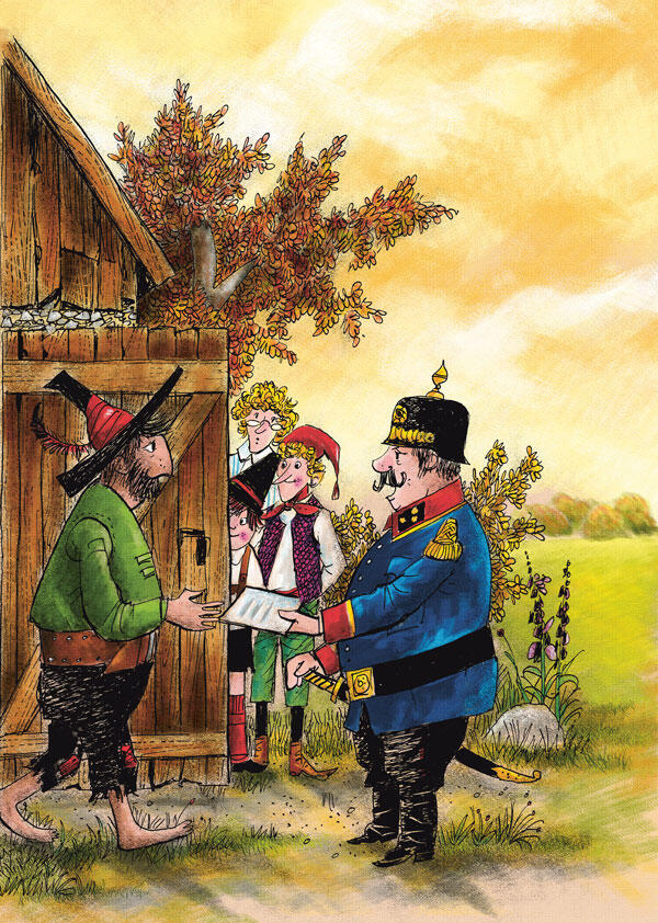 Касперль, Сеппель, бабушка и полицейский застыли, словно громом поражённые. Все были так ошарашены, что некоторое время не могли понять, что происходит. Первым пришёл в себя гауптвахмистр он глубоко вздохнул и вытащил саблю.