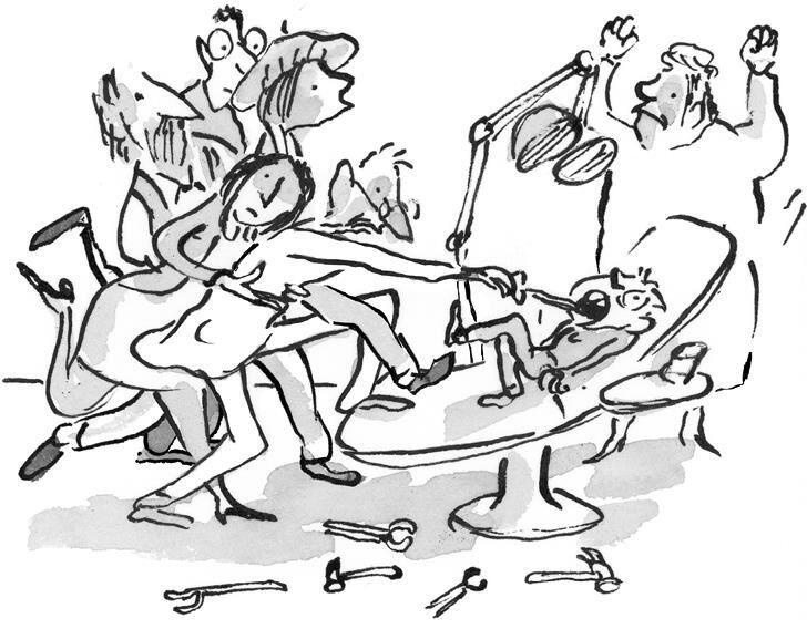 Однако, даже когда длиннющая цепочка вытягивальщиков[1] принялась тянуть изо всех сил, зуб упорно не желал выдергиваться. К тому времени бедняжке Альфи стало совсем скверно. От попыток выдрать зуб было в сто раз хуже, чем от зубной боли. Однако мистер Допотопс твердо решил, что доведет начатое до конца. Обливаясь потом, дантист отхлебнул средства для полоскания рта и со всей силы навалился на щипцы.