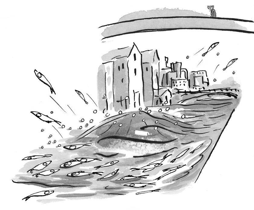 Сделав пару шагов в сторону дома, он вдруг замер, услышав сзади какой-то странный звук. А обернувшись, увидел, что вода под мостом бурлит и кипит, словно на дне канала извергается небольшой вулкан. Мальчик в ужасе смотрел, как на поверхность всплывает дохлая рыба.