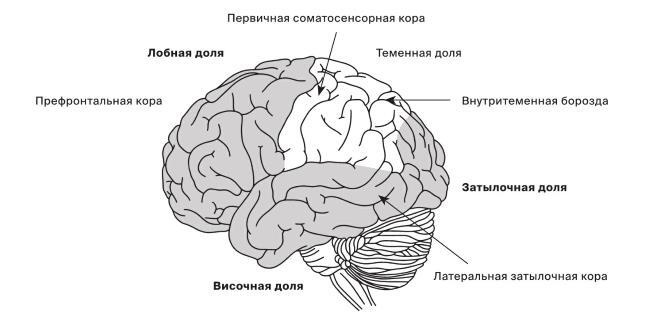 Ил. 1. Схема строения долей левого полушария головного мозга человека, демонстрирующая основные области, упомянутые в тексте.