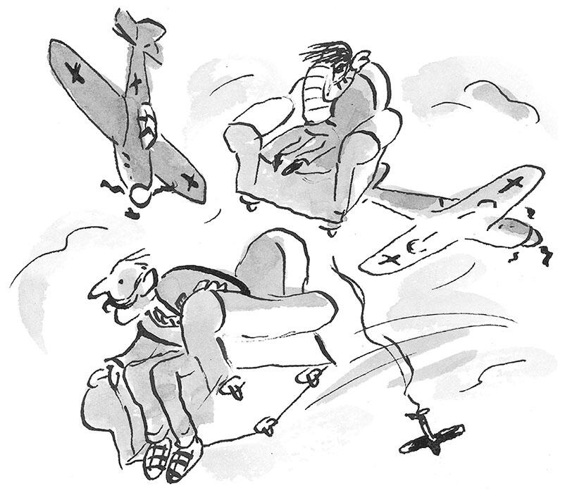 У дедушки был старый проигрыватель в деревянном корпусе и размером примерно с ванну. Он ставил на нем бравурную оркестровую музыку, причем на максимальной громкости. И, разумеется, больше всего любил военные оркестры. Вместе с ним Джек до глубокой ночи слушал классику жанра вроде «Правь, Британия» или «Край славы и надежды»[3]. Два стареньких кресла превращались в кабины самолетов. И когда музыка взмывала ввысь, в воображении дедушка с внуком взмывали вместе с ней на боевых истребителях. Дедушка на «Спитфайре», а Джек на «Харрикейне». Вверх, вверх и прочь. Они вместе реяли над облаками, побеждая вражеские самолеты. Каждое воскресенье двое отважных летчиков выигрывали Битву за Британию, даже не покидая при этом крохотную квартирку дедушки.