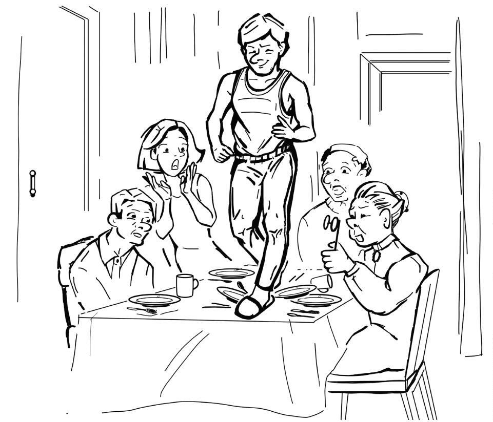 Встаёт из-за стола, качаясь.
