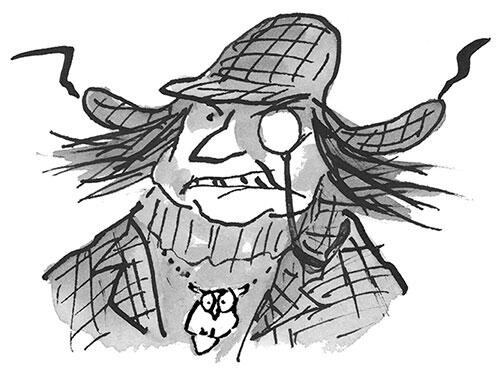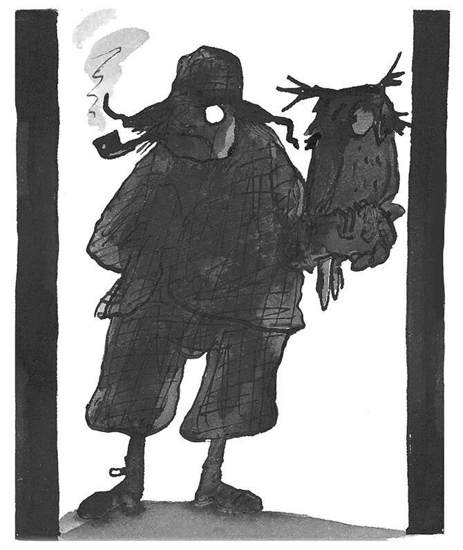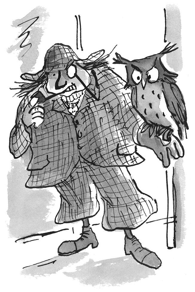 Силуэт был примерно одинаковых размеров что в ширину, что в высоту и хотя очень-очень широк, но все ж не очень высок. А одета стоящая на пороге фигура была в мужской пиджак и бриджи для гольфа (такие, знаете, длинные мешковатые шорты). На голове сидела охотничья шапка-ушанка, причем уши уныло свисали вниз. А изо рта торчала длинная толстая трубка. Очень скоро комнату заволокли клубы отвратительно-сладковатого табачного дыма. На одной руке фигуры виднелась толстая кожаная перчатка. А над перчаткой вырисовывался безошибочно распознаваемый силуэт сыча.