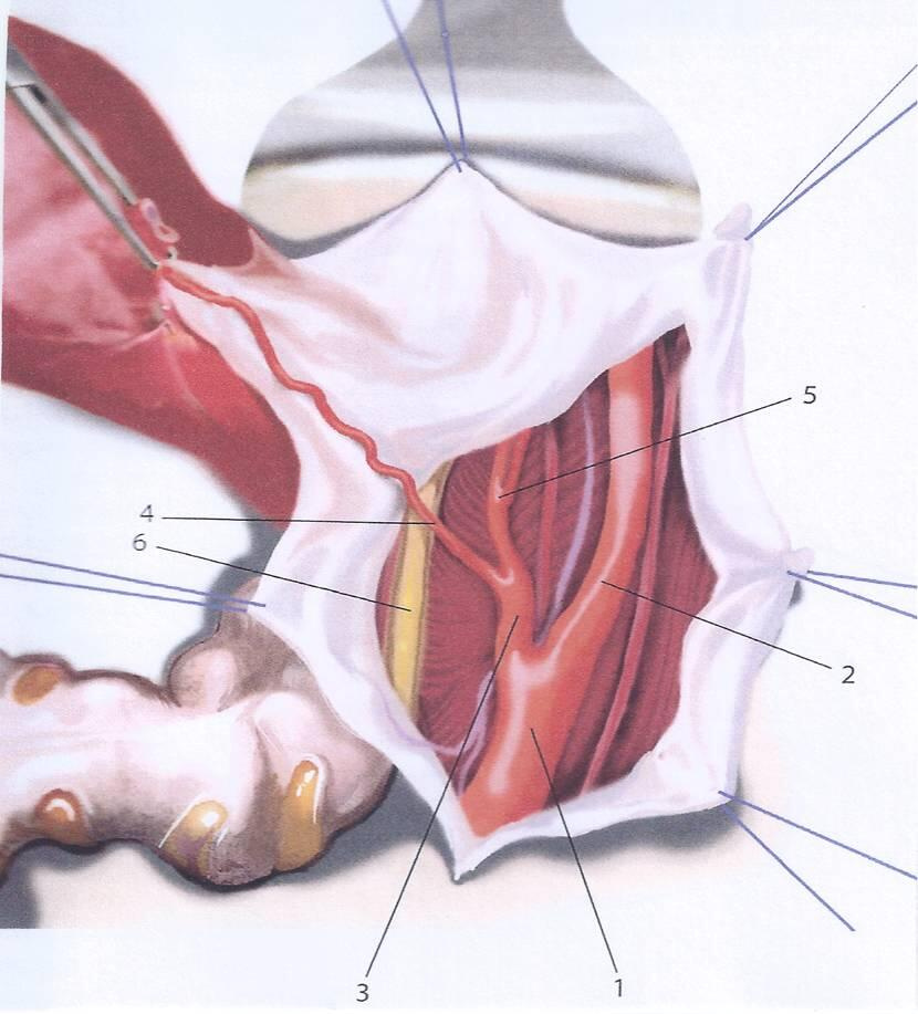 1 общая подвздошная артерия; 2 наружная подвздошная артерия; 3 внутренняя подвздошная артерия; 4 маточная артерия; 5 пузырная артерия; 6 мочеточник.