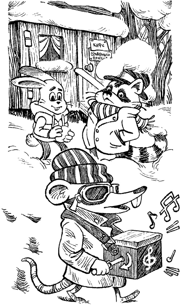 Заяц недоверчиво осмотрел енота, засыпанного снегом, и хотел было спросить, почему тот такой хмурый. Но внезапно из-за угла вынырнула незнакомая фигура и послышалась грустная песня.