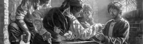 Но катала не прислушался к словам Халвуса, либо счёл их недостаточно убедительными, ибо в следующее мгновение стол был опрокинут вместе с картами, деньгами, так и не тронутым ужином, и в дело пошли кулаки. К шулеру присоединились разгорячённые игрой сотоварищи, послышался хруст костей и глухие удары по набитым хмелем тушкам. Конокрад без особого труда уложил бузотёров и обнажил шпагу. Присутствующие шарахнулись в стороны, образовав пустое пространство, в котором стоял Халвус со шпагой наперевес. Никитичу, ощупывающему собственную челюсть на прочность, ничего не оставалось, как последовать его примеру.