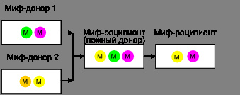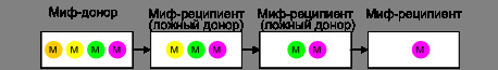 На схеме мы видим механизм передачи мифологем, обозначенных кружками с буквой М. Донор рождает определенные мифологемы и передает часть из них первому реципиенту в цепи. Первый реципиент передает мифологемы второму, а тот третьему. В процессе этой передачи происходит и неизбежное изменение самой мифологемы, а нередко и ее потеря. Из четырех изначальных мифологем донора на схеме в конечном реципиенте сохранилась лишь одна.