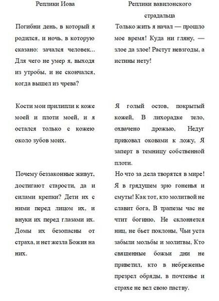 Как мы видим, ряд реплик Иова представляют собой более сложные трансформации фраз вавилонского страдальца. Это не единственные совпадения, и при необходимости можно найти их куда больше.