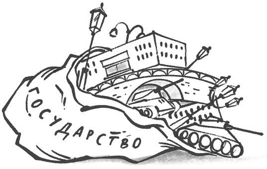 Для того, чтобы предотвратить это печальное положение вещей, и существует государство. По сути своей государство это палка-погонялка, которая заставляет жителей страны участвовать в создании тех самых жизненно важных вещей, о которых мы говорили. Оно организует граждан страны для совместной деятельности там, где они сами скооперироваться не в состоянии. Государство это единственная организация в стране, которая имеет право применять насилие против граждан. Представители государства государственные чиновники внимательно следят, чтобы никто из жителей страны не нарушал ее законов, а также не уклонялся от уплаты налогов денег, которые будут потом направлены на общие нужды. Эти же чиновники заставляют граждан страны идти в армию в случае войны, а в некоторых странах, включая Россию, и в мирное время.