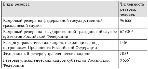 Даже первичный анализ как перечня, так и численного состава кадровых резервов, существующих в государственной сфере в настоящее время, позволяет сделать предположение об их избыточности и возможном дублировании друг друга (табл. 2). Кроме того, существование этих резервов обособленно друг от друга, не позволяет обмениваться данными о лицах, включенных в резервы, заинтересованным в этом государственным органам. Наконец, слишком высокая численность лиц, включенных в резервы (в первую очередь речь идет о кадровых резервах на федеральной государственной гражданской службе и на государственной гражданской службе субъектов Российской Федерации), значительно затрудняет возможность целенаправленной работы с участниками резервов, необходимой для повышения уровня управленческой готовности этой наиболее потенциальной (если это так) группы сотрудников. Подготовка и обучение, управление должностным продвижением, помощь при вхождении в должность и т. д. требуют значительных организационных и финансовых ресурсов, и их выделение в достаточном количестве становится практически невозможным при численности резервов в десятки тысяч человек.