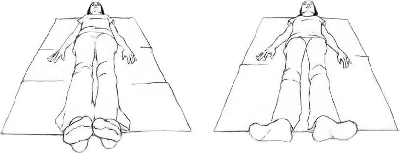 Поверните ноги так, чтобы боковые поверхности ваших больших пальцев соприкоснулись, а затем расслабьтесь, и пусть ваши ноги и ступни снова развернутся наружу. Большие пальцы должны соприкасаться самой широкой частью, чуть пониже ногтя.