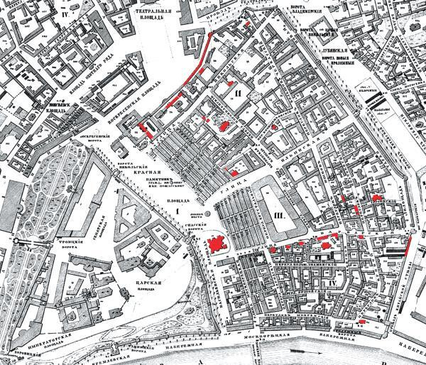 Китайгородские объекты, достоверно построенные ранее основания Петербурга и сохранившиеся до наших дней. Обозначены на плане Москвы 1852 г. Схема автора