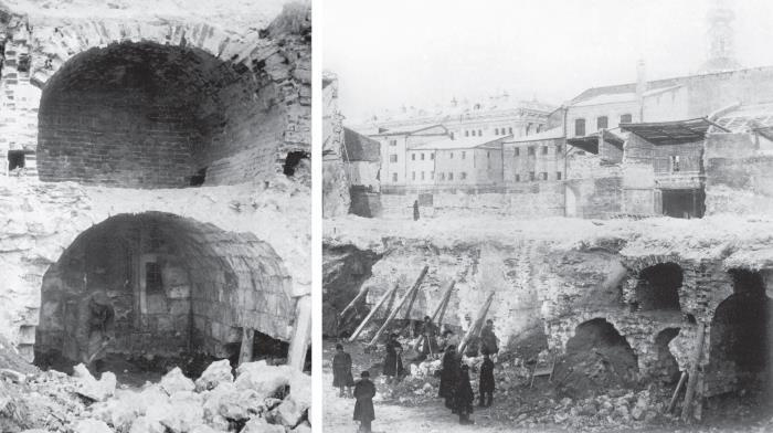 В процессе работ были раскрыты шесть помещений, четыре из которых запечатлены на фотографиях, сделанных членами Археологического общества. В описании сказано: «Некоторые из них глухие, без дверей, но имеющие небольшие полукруглые окна, через которые можно видеть соседние камеры, другие имеют между собой коридорное сообщение»[20]. На фотографиях видно, что устройство камер было близко к схеме, представленной на упомянутых выше чертежах: высокий коридор, разрыв в кладке свода которого, возможно, является световым окном, и двухъярусные лавки подле него. Верхняя комната сложена из кирпича, нижняя из белого камня, одна из комнат имеет дверь и маленькое зарешеченное окно, возможно, смотревшее в проход Суконного ряда. Скорее всего, это была одна из построек, возведенных внутри комплекса в XVII столетии.