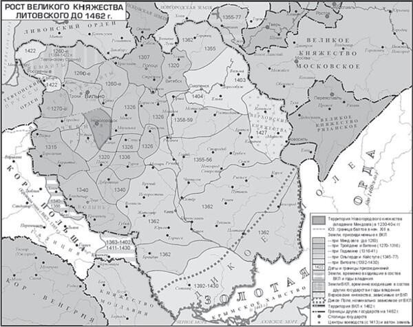 Административно-территориальное деление государства в XIIIXIV вв. характеризуется сохранением старых границ, существовавших между отдельными княжествами до образования ВКЛ. При великом князе Гедимине (13161341) оно существенно не изменилось. После вступления на престол великого князя Ольгерда (13451377) центральная часть была разделена на два военно-административных округа, которые впоследствии были названы Виленским и Трокским воеводствами. Это разделение было вызвано необходимостью отражения нападений Польши и крестоносцев на западе и татар на востоке. Сохранение старого административно-территориального деления и местного самоуправления было выгодно как местным феодалам, сохранившим в своих руках власть в землях, так и центральному правительству, которое на них опиралось. Князья отдельных княжеств, входивших в состав ВКЛ, продолжали называться государями, или братьями великого князя. Например, князья Василий Полоцкий и Федор Ростиславович Минский, прибывшие послами в Новгород, назывались братьями Гедимина. В договоре 1338 г. с Ливонией князья Полоцкий и Витебский, а также Гедимин названы королями.
