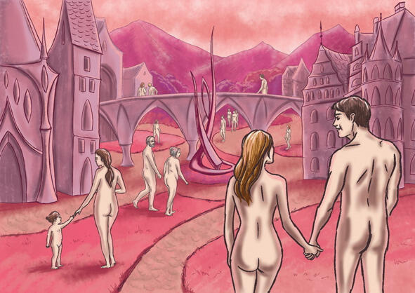 Странно показалось бы одно. На улицах не было никакого транспорта. Плотный людской поток не спеша, хаотично фланировал по чистеньким улочкам, по ковровым газончикам, не разбирая дороги и в неопределенных направлениях. Как броуновское движение молекул. И уж совсем необычно все люди (если это люди) были обнаженными. И грудные младенцы, и изящные в своей молодой эстетичной пластике юноши и девушки, и согбенные старцы. Все прогуливались словно на нудистском пляже в чем мать родила. И их лица под стать окружающему миру светились счастьем, покоем и умиротворением.