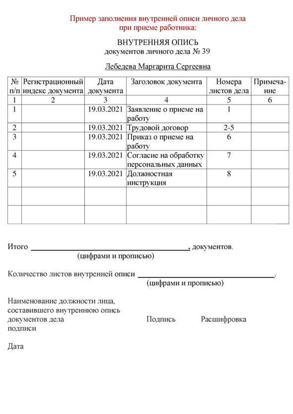 Когда первые документы о приеме помещены в личное дело работника, в начало папки прикрепляется внутренняя опись. Этот учетный документ специалист по кадрам будет заполнять на протяжении всей трудовой деятельности и вплоть до увольнения работника, а первые сведения в описи данные документов, сформированных при приеме работника.