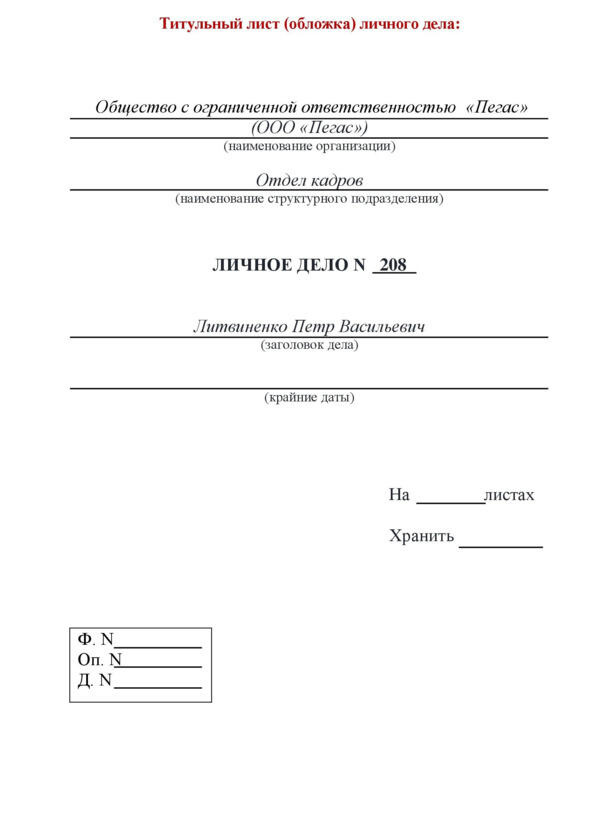 заголовок дела (фамилия, имя и отчество сотрудника, на которого заведено личное дело);