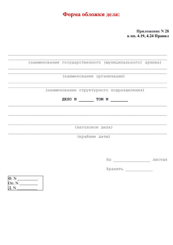 Форма обложки дела (титульного листа) указана в приложении 28 к Правилам 2015, а в пунктах 4.25, 4.28, 4.29 содержатся требования к реквизитам, которые должен содержать бланк титульного листа дела: