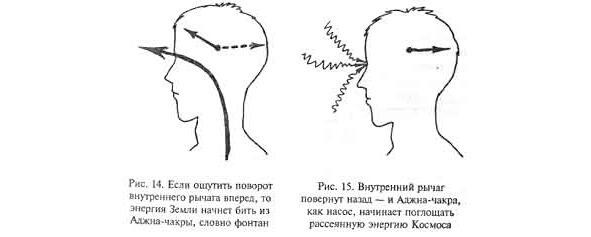Поэтому активизируем в себе ощущения, связанные с управлением потоками. Начнем с восходящего потока. Сядьте или встаньте прямо, отбросьте мысли, сосредоточьтесь только на ощущениях внутри своего тела. Уловите перед позвоночником движение энергии снизу вверх -от первой чакры ко второй, затем к третьей и так до седьмой. Поток выходит из Земли и, проходя сквозь ваше тело, через макушку головы устремляется вертикально вверх, в глубины Космоса. Начинайте делать вдохи и выдохи ощутите, как при вдохе поток активизируется, становится сильнее, как вы при помощи вдоха можете сделать поток интенсивнее. Когда ощущение движения потока станет ясным и четким, представьте себе, что в центре вашей головы укреплена стрелка, которую вы по своей воле можете поворачивать в любую сторону, что-то вроде флюгера. Поверните ее вперед. Вы почувствуете, как поток, устремляясь вверх, доходит до верхних чакр и начинает выплескиваться наружу, направляясь вперед, из области примерно между бровями, из Аджна-чакры.
