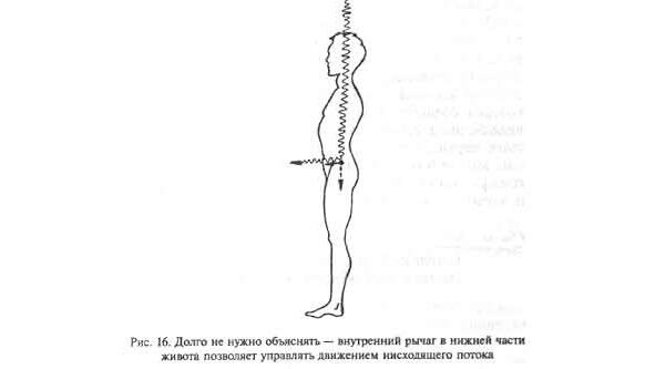 Сосредоточьтесь, расслабьтесь, почуветвуйте, как сквозь седьмую чакру в ваше тело из глубин Космоса входит вертикальный нисходящий поток энергии и, проходя вплотную к позвоночнику, доходит до первой чакры, через которую уходит в землю. Начинайте делать вдохи и выдохи и ощутите, как при выдохе нисходящий поток усиливается, как вы можете замедлять и ускорять его ход, делая вдохи то более, то менее интенсивно. Когда ощущение потока станет ясным и четким, ощутите, что поворачивающаяся стрелка установлена у вас в области третьей чакры, чуть выше пупка. Поверните стрелку вперед. Почувствуйте, как энергия нисходящего потока начинает вырываться через третью чакру.