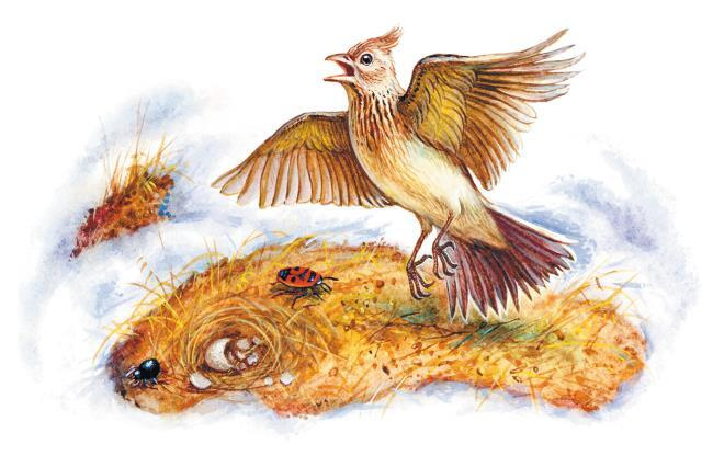 Из множества звуков земли: пения птиц, трепетания листвы на деревьях, треска кузнечиков, журчания лесного ручья, самый весёлый и радостный звук песня полевых и луговых жаворонков. Ещё ранней весною, когда на полях лежит рыхлый снег, но уже кое-где на пригреве образовались первые тёмные проталины, прилетают и начинают петь наши ранние весенние гости жаворонки. Столбом поднимаясь в небо, трепеща крылышками, насквозь пронизанными солнечным светом, выше и выше взлетает в небо жаворонок, исчезает в сияющей голубизне. Удивительно красива, звонка песня жаворонка, приветствующего приход весны. На дыхание пробудившейся земли похожа эта радостная песня.