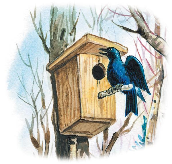 Сидящего у скворечни скворца хорошо можно разглядеть: его чёрные с зеленоватым отливом пёрышки, трепещущие кончики крыльев. Скворцы мирно и дружно живут между собою. Как-то я наблюдал, как скворцы и скворчихи из соседних скворечен подлетали к скворчиному домику, в котором уже вывелись маленькие птенцы. Они заглядывали в чужой домик и, казалось, поздравляли счастливых родителей.