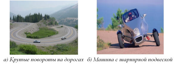Шасси автомобиля делают динамичным. Подвеску делают с шарнирными связями. Автомобиль имеет возможность наклоняться на поворотах (рис. 22.37б).