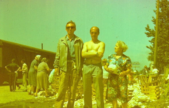 Нашей группе досталась капуста. Кочаны огромные, твердые урожай ранней капусты только недавно доставлен с полей. Наша задача была обрывать завялые листочки и перекладывать овощи из контейнера в хранилище. Трое обрывали листочки, а остальные, выстроившись в колонну на расстоянии броска и ловко перекидывая кочаны друг другу, быстро опустошили все контейнеры и забили склад для хранения капусты. Выполнили работу раньше положенного срока и скоро уже сидели на перекуре.