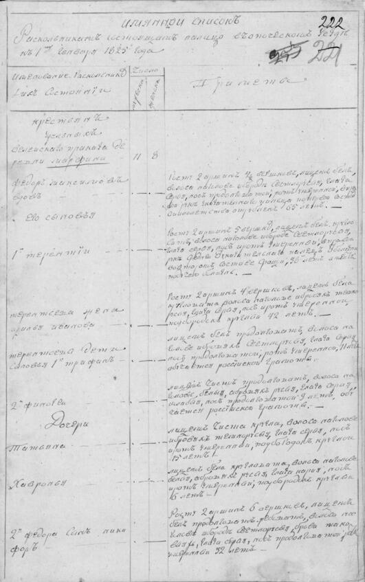 "Имянной список раскольников состоящих на лицо в Опоческом уезде к 1-му генваря 1825 году" (ГАПО. Ф. 20. Оп. 1. Д. 650. Л. 222)