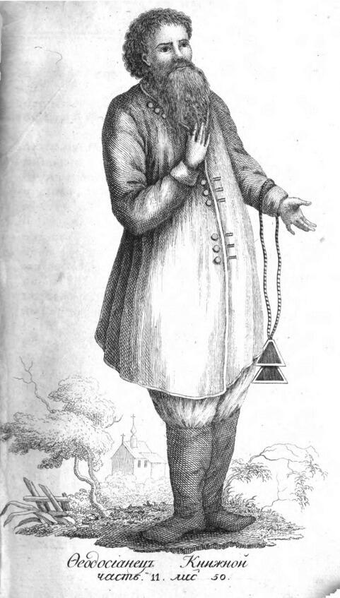 «Феодосианец книжной». Гравюра из книги А. И. Журавлева «Полное историческое известие о древних стригольниках и новых раскольниках, так называемых старообрядцах» (1795)