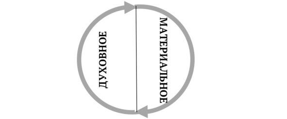 По закону диалектики о единстве и борьбе противоположностей эти две половинки материальная и духовная находятся в непрерывном движении, заставляя человека развиваться, приобретать новые знания, творить, создавать всё более новое и лучшее, тем самым совершенствуя себя и мир вокруг. Этот процесс бесконечный, и каждый раз он возобновляется снова и снова, двигаясь по спирали вверх. Вот почему на всём протяжении существования человечества происходит его постоянное развитие, движение вперёд и прогресс.