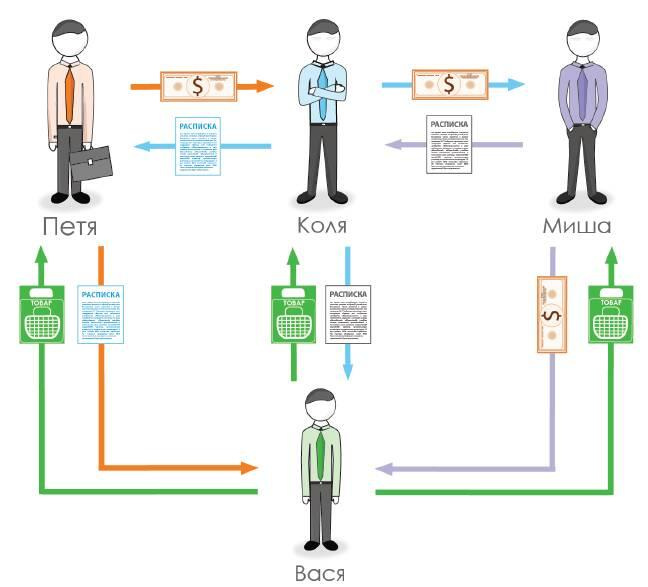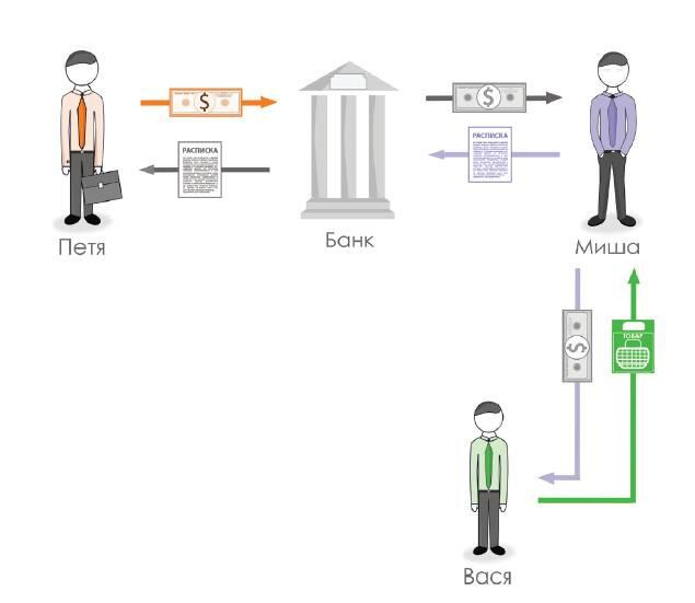 Начнем с бытовой ситуации: у Пети есть 100 , и он дает их в долг Коле под расписку. Коля может купить у Васи товаров на 100 . Петя тоже может купить у Васи товаров на 100 , расплатившись распиской Коли, если Вася, так же, как и Петя, доверяет Коле и считает, что тот сможет вернуть 100 . Получается, мнение Пети и Васи о том, что Коля может вернуть долг, позволило Васе продать товаров на 200 , при том, что в наличии имелось только 100 .