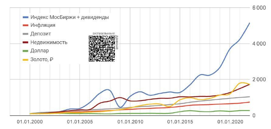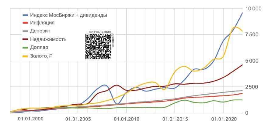 Если же рассмотреть период с конца 1999 по конец 2021 года, то наилучший результат продолжают удерживать вложения в акции (5 164 с учетом дивидендов). Золото по итогам года переместилось на третье место (1 723 ), уступив вторе место заметно подорожавшей недвижимости (1 728 ).