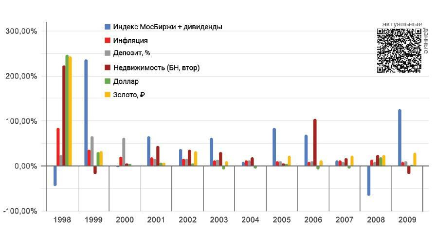 В данном материале приводится обобщенный сравнительный обзор эффективности инвестирования в такие инструменты, как акции, недвижимость, депозит, золото, валюта. Приведенные расчеты не учитывают транзакционные издержки, связанные с приобретением и владением рассматриваемыми активами, что может оказать существенное влияние на фактическую доходность.