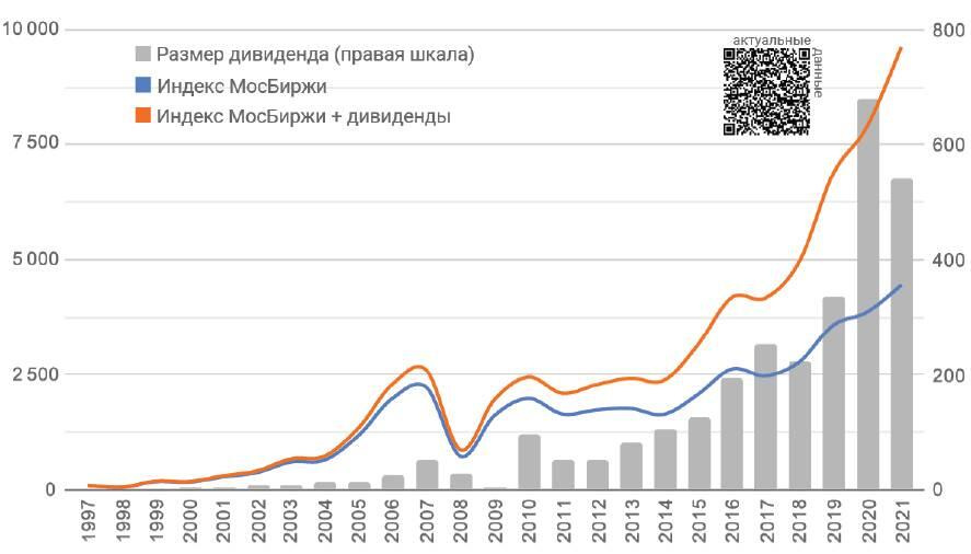 На отрезке с конца 1997 по конец 2004 года мы оценили среднюю дивидендную доходность на уровне 2% в год. С 2005 по 2021 год для определения дивидендной доходности мы использовали сравнение индекса МосБиржи и индекса MCFTR (индекс МосБиржи полной доходности, отражающий изменение суммарной стоимости цен российских акций, включенных в расчет индекса МосБиржи, с учетом дивидендных выплат и без учета налогообложения доходов, полученных в виде дивидендов). Средняя дивидендная доходность в этот период составила 4,48%. Дивидендная доходность по итогам 2021 года составила 6,6%.