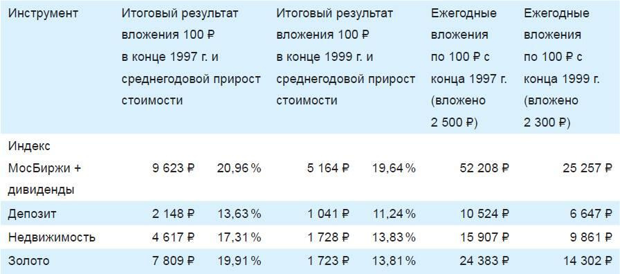 Давайте рассмотрим, каким именно образом дивидендная доходность по акциям скажется на расчетах при инвестировании 100 в конце 1997 года в индекс МосБиржи.