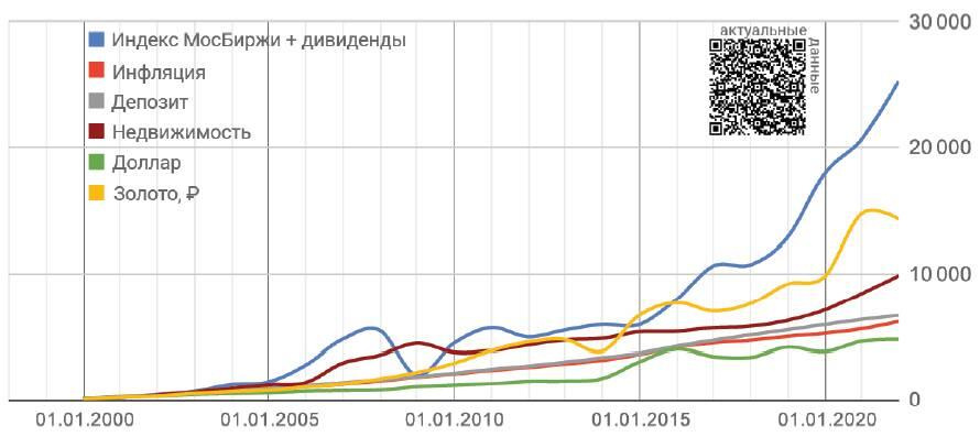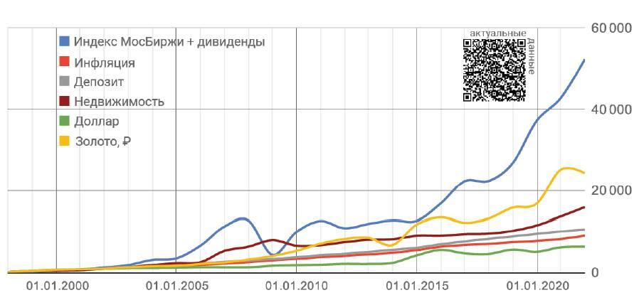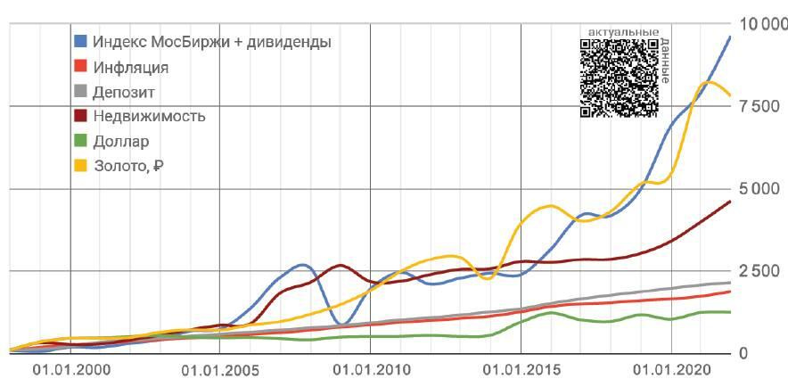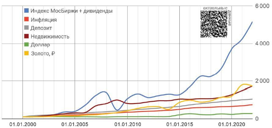 За период с конца 1999 по конец 2021 года наилучший результат на протяжении последних 13 лет демонстрируют вложения в акции 5 164 (с учетом реинвестиции получаемых дивидендов). Недвижимость переместилась на второе место (1 728 ) благодаря значительному росту в 2020 и 2021 гг. Золото в рублевой оценке по итогам 2021 года опустилось на третье место (1 723 ).