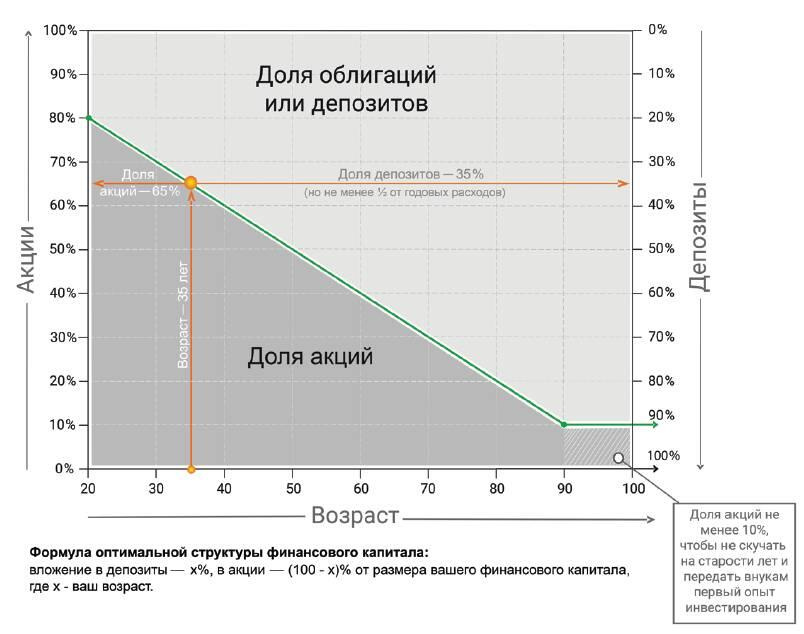 1. Держите на банковских депозитах Х%, а в акциях (100 Х)% от размера своего финансового капитала, где Х ваш возраст. Такая структура защитит ваши сбережения в молодости от потери покупательной способности из-за инфляции, а в старости снизит зависимость от колебаний стоимости акций.