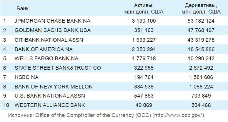 Наличие крупных игроков на рынке деривативов подтверждается данными об объеме открытых позиций крупнейших американских банков к общему объему открытых позиций.
