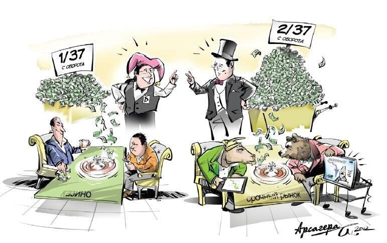 Даже если исключить из расчета «комиссию» инсайдеров, манипуляторов и пр. (это для тех, кто считает, что на срочном рынке работают только кристально честные люди и никто никогда, например, не будет двигать котировки для принудительного закрытия позиций), ваша вероятность выигрыша 47,99%, а доход «казино» срочного рынка (ваша плата) с оборота 4,03%.