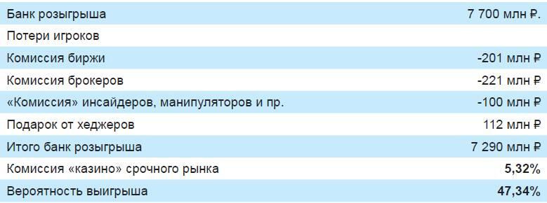 потери игроков не будут полными, если мы не учтем влияние на банк, который находится в розыгрыше, различных злоупотреблений: инсайдеров, фронтраннеров и прочих манипуляторов. Эту статью расходов мы можем предположить лишь экспертно: оценим ее как половину доходов брокеров на контракте, то есть около 100 млн .