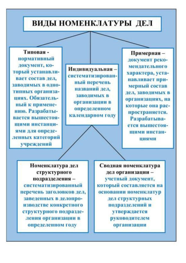 Типовые и примерные номенклатуры дел используются для составления индивидуальных номенклатур дел организаций и их структурных подразделений. Сроки дел из типовых и примерных переносятся в индивидуальную номенклатуру дел без изменений. В организациях и учреждениях со сложной структурой составляется номенклатура дел структурного подразделения. На основе номенклатур дел структурных подразделений составляется сводная номенклатура дел организации и утверждается руководителем организации.
